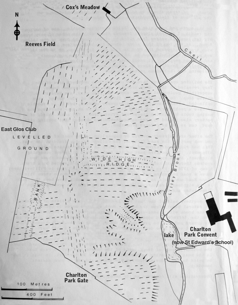 Consequently, by the time Bovis Homes commenced building over 'Old Park', having purchased some 29 acres of Charlton Park west of the Lilley Brook in 1975, pretty much all that remained visible were many beautiful old trees, fading traces of old roads, numerous ridge and furrow cultivation strips and their plough headlands. Prior to it becoming an ornamental and recreational deer-park in the 18th century it appears the surface had been arable throughout earlier centuries, as well as left for grazing by deer and other livestock, or swathing for hay and corn, before during and after the 17th and 18th Century landscape, waterscape and tree planting work. In the 1970s Bernard Rawes' ground inspection interpreted some five ridge and furrow field-systems, massively heaved-up during earlier centuries of ox-ploughing and manual cultivation, which with some field boundaries could all be seen until about 1976. A wide track-way crossing the park was also discernible, which he believed was once part of a London to Cheltenham route during the eighteenth century and much earlier. It is believed to have forked under what is now called Reeves' Field to join the Old Bath Road, the other 'fork' crossing the River Chelt at Sand-ford, near Sandford Mill, where another ancient route ran north to Prestbury along Cheltenham's east parish boundary.