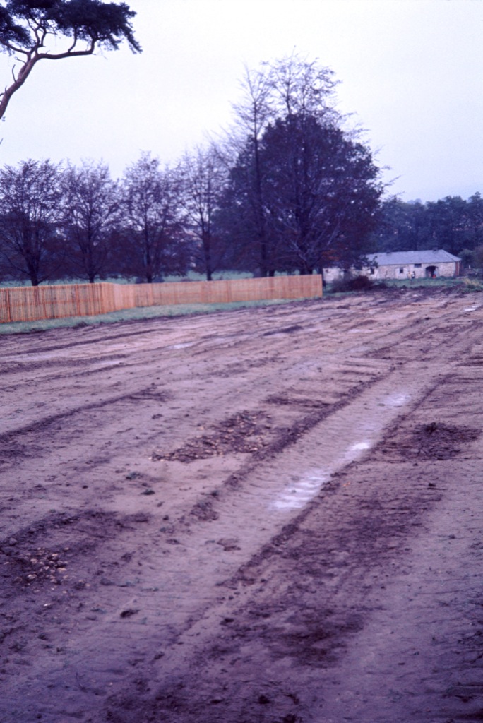 Stage One - spring 1976, Bovis prepare the ground for what became King Arthur Close, including the new border fence against Reeves Field. The ownership and maintenance of the fence later became subject of legal dispute and correspondence. The old Cox's Meadow farm building/stable block seen in the background appears on some of the old maps at the beginning of this article, and possibly in one of Dorothy Vassar-Smith's 1920s photographs. The building was demolished a few years later, well before the Environment Agency moved in to commence their flood alleviation scheme in 2005/6.