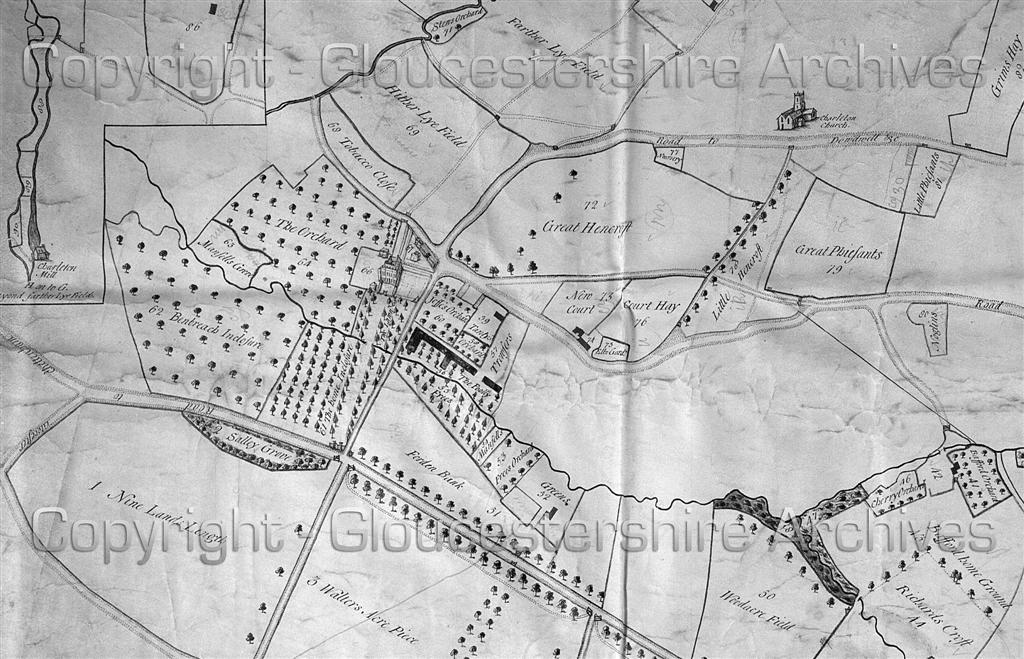 © Gloucestershire ArchivesThis closer view of the 1746 Estate Map better shows the tree-lined Old London Road/Sandy Road crossing the park from the lower right edge, parallel with the Lilley Brook towards Cheltenham, before its closure and diversion in the 1780s.