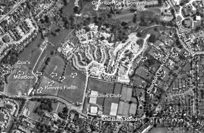 Arrows indicate the approximate route of the pre-1780s 'Old London Road' from Sandy Lane/Moorend Road on the right of this 1982 aerial photograph across Charlton Park to Old Bath Road and Sandford Mill on the left.
